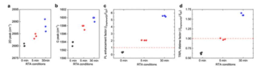 圖5. 石墨烯快速熱退火(RTA)條件,用于石墨烯/量子點混合維度異質(zhì)結(jié)構(gòu)與10納米GaAs蓋子樣品。RTA溫度為400℃。拉曼測量中石墨烯/二氧化硅/硅(a)2D和(b)G峰的演變。(c)光致發(fā)光強度和(d)時間分辨的光致發(fā)光壽命增強因子取決于RTA條件。
