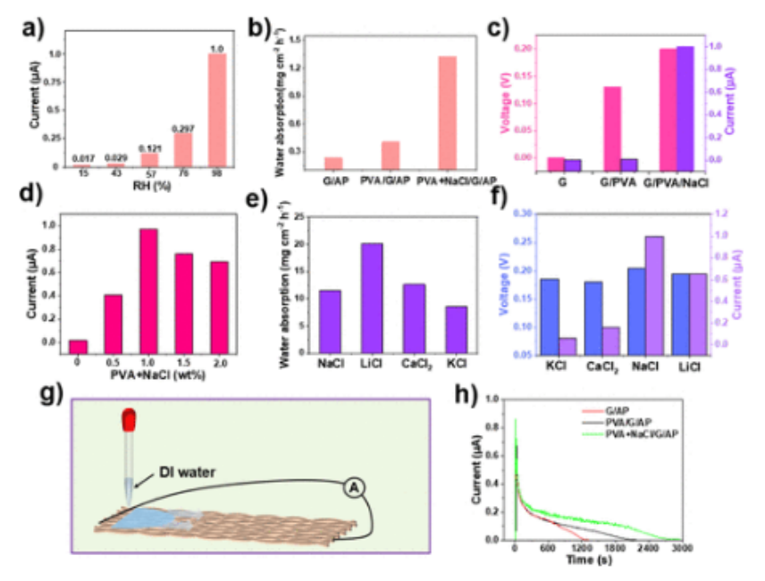 圖5. 器件的性能分析。(a) 裝置的短路電流隨濕度變化。(b) 離子水凝膠成分對(duì)吸水率的影響。(c) 離子水凝膠成分對(duì)輸出信號(hào)的影響。(d) 離子濃度對(duì)設(shè)備輸出信號(hào)的影響。(e) 采用不同成分的離子水凝膠對(duì)裝置吸水率的變化。(f) 不同離子成分對(duì)裝置輸出性能的影響。(g) 向具有不同成分的薄膜的一端加水的示意圖。(h) 當(dāng)相同體積的去離子水被添加到不同成分的薄膜中時(shí),輸出性能發(fā)生了變化。
