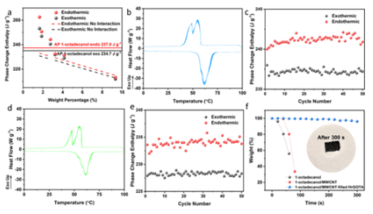 圖3. (a) 填充1-十八醇的HrGOT的內(nèi)熱和外熱相變焓值與它們的石墨烯重量百分比有關(guān)。(b) 1-十八醇填充的HrGOT在50次加熱-冷卻循環(huán)中的DSC曲線。(c) 1-十八醇填充的HrGOT的內(nèi)熱和外熱相變焓值作為加熱-冷卻循環(huán)的函數(shù)。(d) 1-十八醇/MWCNT填充的HrGOT在50次加熱-冷卻循環(huán)中的DSC曲線。(e) 1-十八醇/MWCNT填充的HrGOT的內(nèi)熱和外熱相變焓值作為加熱-冷卻循環(huán)的函數(shù)。(f) 1-十八醇、1-十八醇/MWCNT和1-十八醇/MWCNT填充的HrGOT在熱板加熱300秒內(nèi)的質(zhì)量保留百分比。