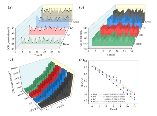 0/GO可提高COD 91.8%的去除率,511 mL/12 h產(chǎn)氣量,并具有較好的污泥絮凝效果。通過(guò)改變pH和Fe