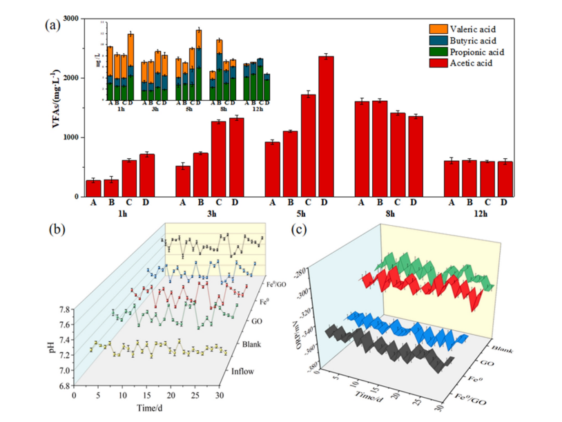 圖2. (a)廢水中揮發(fā)性脂肪酸隨時(shí)間的變化。A:空白;B:GO;C:Fe