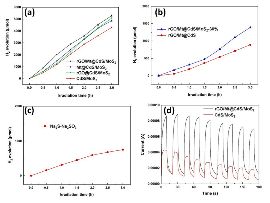 3溶液中的光催化析氫性能。(d)可見光照射下rGO/Mt@CdS/MoS