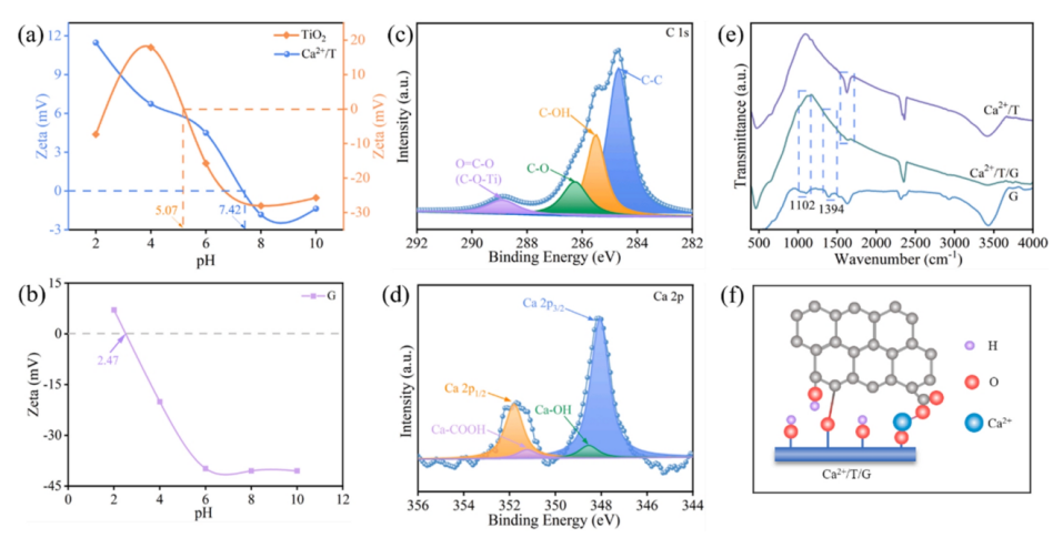 2+/T/G的(c) C 1s和(d) C 2p的高分辨率XPS光譜。(e) G、Ca