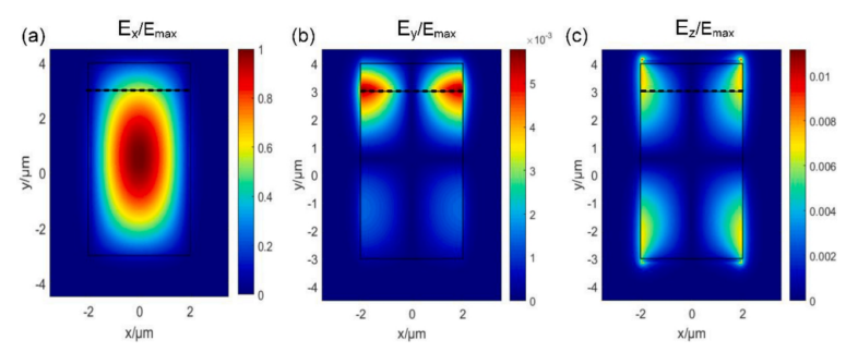 圖3. GSHW的準(zhǔn)-TE模態(tài)分布。(a)電場x分量。(b)電場y分量。(c)電場z分量。