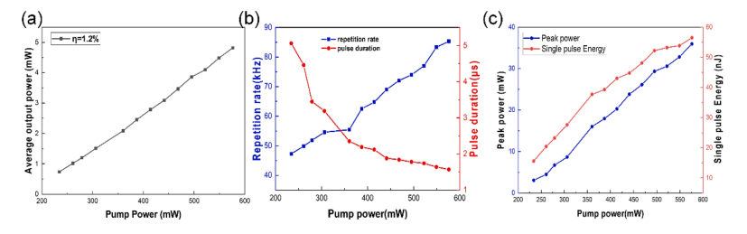 圖7. (a)平均輸出功率與泵浦功率之比。使用單層石墨烯的實(shí)驗(yàn)數(shù)據(jù)用黑色實(shí)心方塊表示。(b)脈沖寬度和脈沖重復(fù)率隨泵浦功率增加時的變化。(c)脈沖能量和脈沖峰值功率與泵浦功率的關(guān)系。