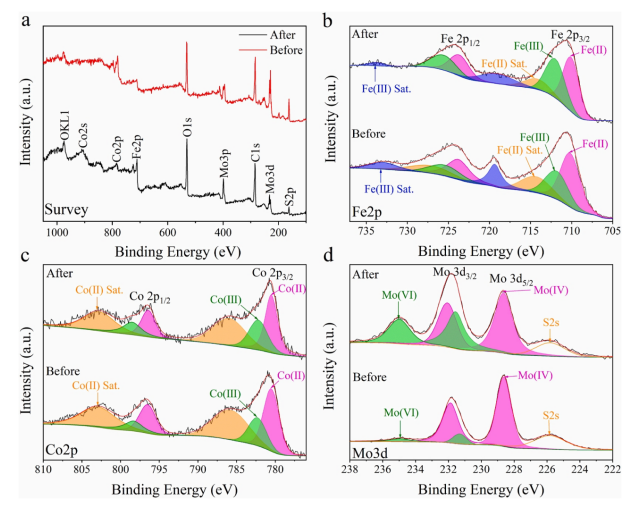圖4. SFCMG的XPS圖譜:(a)Survey,(b)Fe 2p,(c)Co 2p和(d)Mo 3d。