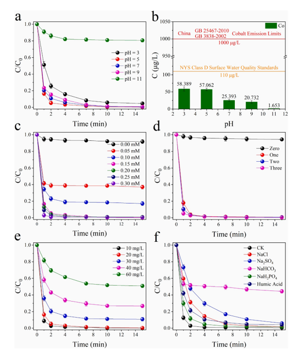 圖5. (a) pH、(c) PMS濃度、(d) SFCMG用量(尺寸:1×1×1 cm)、(e) RhB初始濃度、(f)多種干擾離子對RhB去除率的影響;(b)不同pH下Co的浸出。