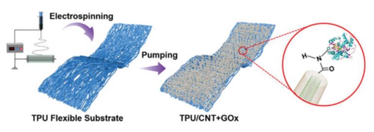 隨著植入式微電子的新興需求,它本質(zhì)上需要完全集成和可靠的電源。該研究報(bào)告了一種可拉伸且靈活的基于靜電紡絲的葡萄糖/O2具有葡萄糖氧化酶生物陽極、Pt/C 陰極和熱塑性聚氨酯基板的生物燃料電池,能夠適應(yīng)個體運(yùn)動引起的各種應(yīng)力和應(yīng)變。熱塑性聚氨酯的剛性苯環(huán)和彈性鏈段保證了其優(yōu)越的拉伸性能。此外,通過酰胺反應(yīng)在3D熱塑性聚氨酯網(wǎng)絡(luò)中建立活性碳納米管(CNTs-COOH)和葡萄糖氧化酶之間穩(wěn)定的共價(jià)連接,以確保生物陽極的快速直接電子轉(zhuǎn)移和柔性環(huán)境中設(shè)備的穩(wěn)定功率輸出。該生物燃料電池具有 0.575 V 的開路電壓和 57 µW cm