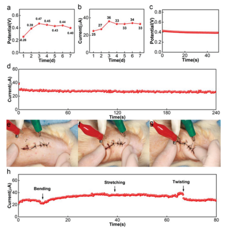 Fig 4.a) OCP 和 b) 植入式 BFC 裝置一周內(nèi)的體內(nèi)電流變化;c) OCP 和 d) 第2天體內(nèi) CA 測量;e) 彎曲、f) 拉伸和 g) SD 大鼠背部皮膚植入部位的扭曲條件和 h) 在 0.2 V 下的相應(yīng)穩(wěn)定性表征的示意圖。