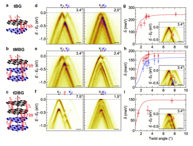 2方向上分別以2個(gè)扭轉(zhuǎn)角對(duì)tBG、tMBG和tDBG進(jìn)行切割。(g–i)分別為tBG、tMBG和tDBG的雜交間隙大小與扭曲角的關(guān)系圖。實(shí)線對(duì)應(yīng)于從模擬光譜中提取的數(shù)據(jù),數(shù)據(jù)指向來自實(shí)驗(yàn)光譜的數(shù)據(jù)。插圖顯示了相應(yīng)層幾何結(jié)構(gòu)在θ=3.4°時(shí)的模擬ARPES光譜,并標(biāo)記了雜交間隙。所有比例尺均為0.1Å