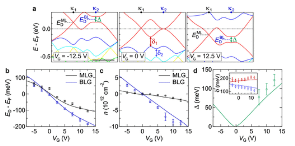 D)、雙層間隙大小(Δ)和雜化間隙大?。?delta;)。比例尺為0.1Å-1。(b,c)對(duì)于單層(黑色)和雙層(藍(lán)色)狄拉克錐,狄拉克點(diǎn)能量E