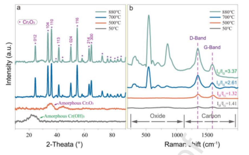圖1. (a) XRD圖案和(b) Coating@CNTs-X℃(X: 50、500、700、880)的拉曼光譜。