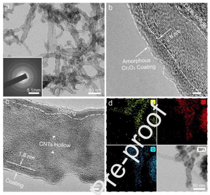 圖2. Coating@CNTs-50℃的顯微結(jié)構(gòu)和成分。(a)亮場TEM圖像和SAED圖像,(b)元素映射結(jié)果,(c)單CNTs無定形Cr(OH)