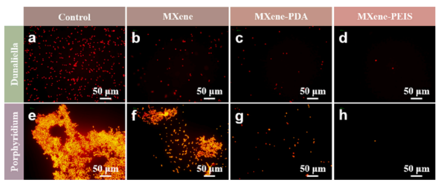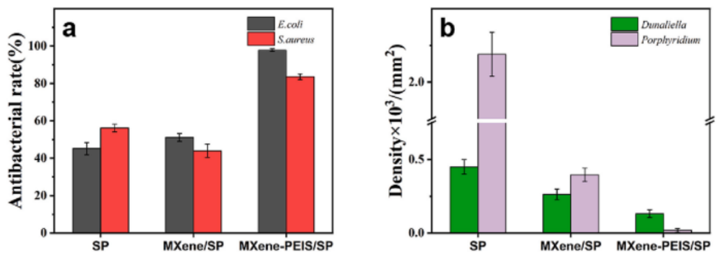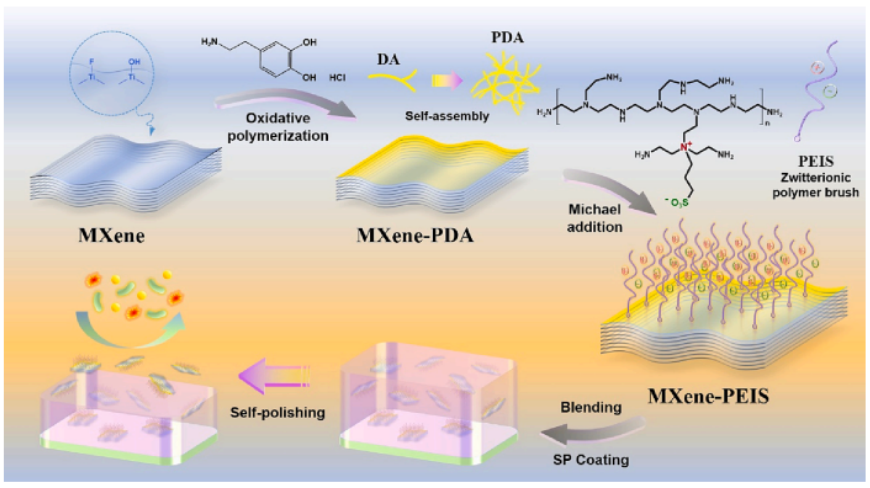 海洋生物污染是一個(gè)全球性的問題,給海洋工程帶來了重大挑戰(zhàn)。MXene納米片和兩性離子聚合物是一種很有前景的海洋抗生物污染材料,備受關(guān)注。本文中,我們在MXene納米片表面自組裝聚多巴胺層(MXene-PDA),然后通過邁克爾加成反應(yīng)將兩性離子聚合物(PEIS)引入PDA層,得到兩性離子聚合物功能化的MXene納米片(MXene-PEIS)。通過MXene納米片與兩性離子聚合物PEIS的協(xié)同抗污作用,MXene-PEIS表現(xiàn)出了優(yōu)異的抗污性能(抗菌率提高了88%,微藻黏附密度降低了98%)。此外,將制備好的MXene-PEIS納米片與自拋光涂層共混,得到了納米復(fù)合防污涂層(MXene-PEIS/ SP)。結(jié)果表明,MXene-PEIS/SP涂層具有良好的防污性能,這是由于MXene、PEIS和自拋光涂層之間的協(xié)同作用。