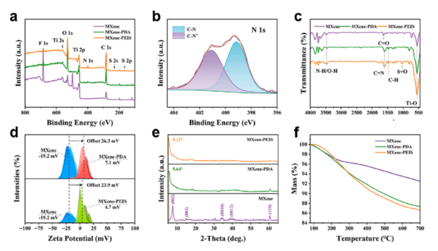 圖2. (a) MXene、MXene- pda和MXene- peis的XPS測量光譜;(b) MXene-PEIS N1s的擬合XPS光譜;(c) FT-IR光譜;(d) Zeta電位;(e) XRD圖案;(f) MXene、MXene- pda和MXene- peis的TG曲線。