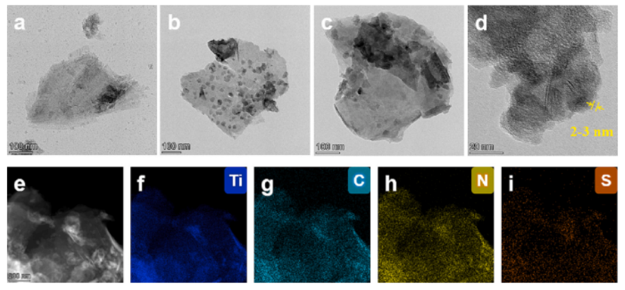 圖3. (a) MXene、(b) MXene- pda和(c) MXene- peis的TEM圖像;(d) MXene-PEIS的高分辨率TEM圖像;(e) MXene-PEIS HAADF-STEM圖像;以及(f)鈦、(g)碳、(h)氮、(i)硫元素對應(yīng)的EDS圖。
