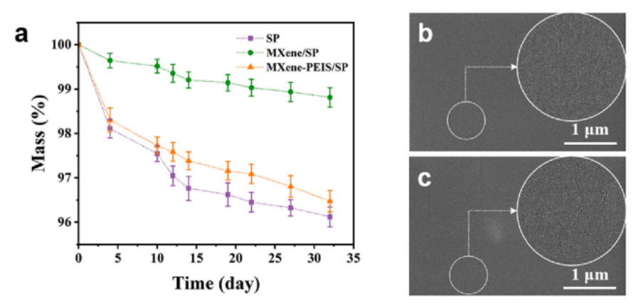 圖7(a) SP、MXene/SP、MXene- peis /SP在去離子水中的水解隨時(shí)間的變化;MXene-PEIS/SP在去離子水中水解前后的SEM圖像(b)和(c)。