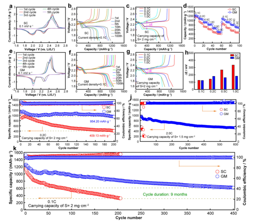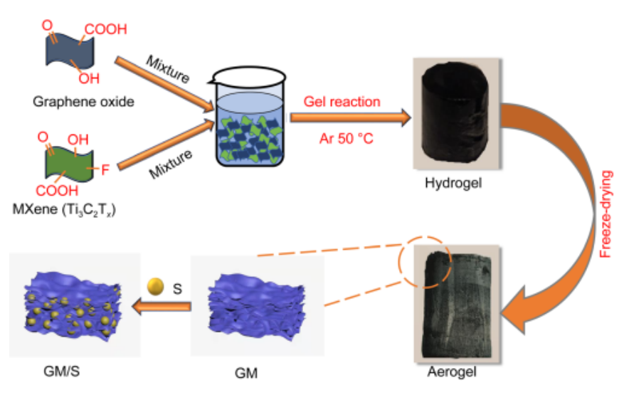x) (GM)氣凝膠,并將其應(yīng)用于鋰硫電池。該策略將二維(2D) GO片和高導(dǎo)電性MXene納米片集成在一起,形成三維多孔氣凝膠結(jié)構(gòu),形成三維導(dǎo)電網(wǎng)絡(luò)和大極性表面,可同時(shí)實(shí)現(xiàn)快速的鋰離子/電子傳遞、強(qiáng)化學(xué)錨定硫以及促進(jìn)多硫化物之間的氧化還原反應(yīng)。因此,陰極顯示出良好的硫利用率和循環(huán)穩(wěn)定性。制備的GM電極電池已在0.1C下進(jìn)行了近9個(gè)月的測(cè)試,提供了1255.62 mAhg