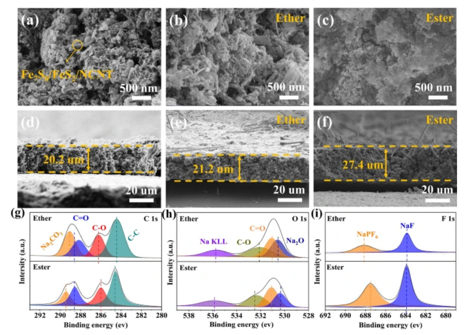 −1下循環(huán)100次后,(b, e)醚和(c, f)酯基電解質(zhì)的SEM和橫截面圖像;Fe