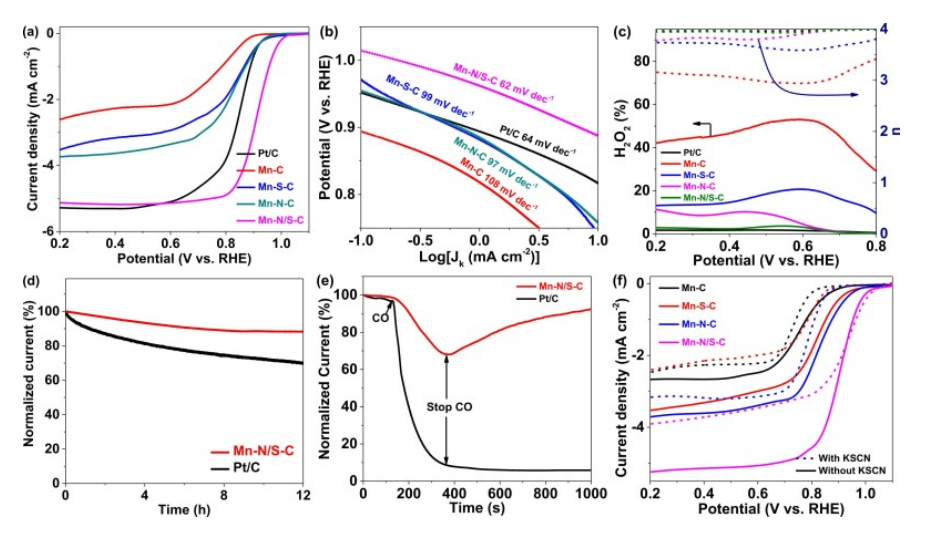 2產率。(d) Mn-N/SC 和 Pt/C 在 0.6 V 時的計時電流響應。(e) Mn-N/SC 和 Pt/C 在 0.6 V 時對一氧化碳的耐受性。(f) Mn- 的 ORR 極化曲線C、Mn-SC、Mn-NC 和 Mn-N/SC,不含(實線)和含(虛線)10 mM KSCN。