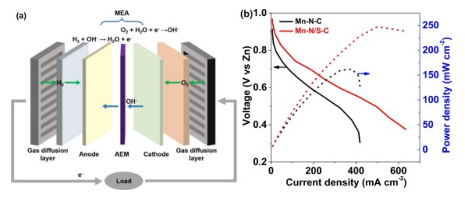 Fig 6. (a) AEMFC 示意圖。(b) 基于 Mn-NC 和基于 Mn-N/SC 的 H