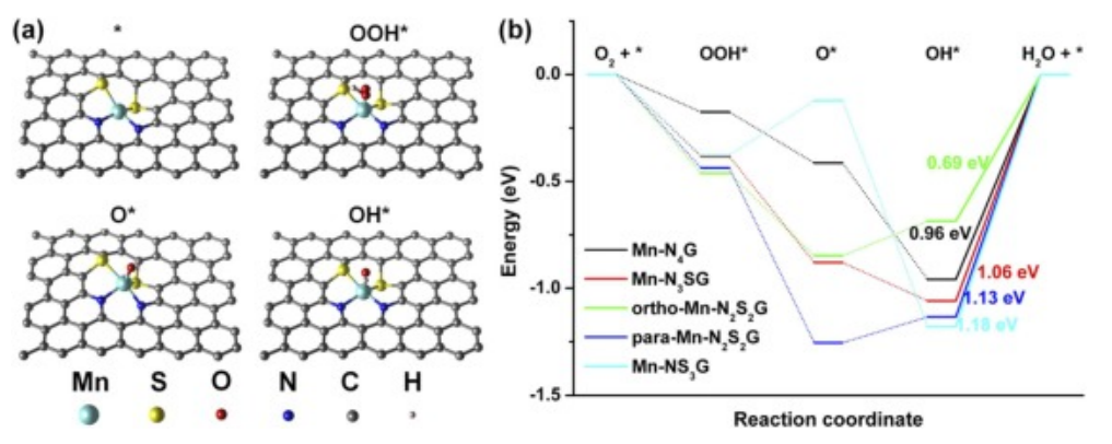 -2的功率密度和優(yōu)異的輸出穩(wěn)定性。在陰離子交換膜燃料電池(AEMFC)中,與無S的Mn-N-C催化劑相比,Mn-N/S-C的最大功率密度提高了1.53倍。實驗表征和理論模擬都揭示了Mn-N/S-C中的主要活性位點是嵌入石墨烯中的Mn-N