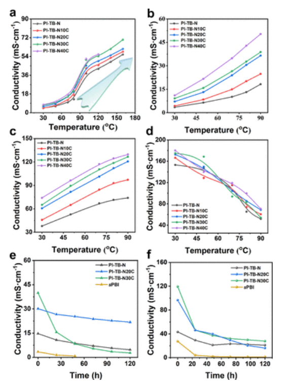 Fig 5. 膜的質(zhì)子傳導(dǎo)率。(a) 寬溫 (30–160℃) 依賴的PA 摻雜PEM的質(zhì)子電導(dǎo)率,無需加濕。PI-TB-N40C 膜只能在高達(dá) 120℃ 的溫度下進(jìn)行測(cè)試,因?yàn)樗?140℃ 以上會(huì)溶解。(b) 質(zhì)子電導(dǎo)率在 20% RH 下的 LT (30–90℃) 穩(wěn)定性。(c) 質(zhì)子電導(dǎo)率在60% RH 下的 LT (30–90℃) 穩(wěn)定性。(d) 質(zhì)子電導(dǎo)率在 100% RH 下的 LT (30–90℃) 穩(wěn)定性。(e) 質(zhì)子電導(dǎo)率在 20% RH 下的 LT (80℃) 穩(wěn)定性。(f) 質(zhì)子電導(dǎo)率在 60% RH 下的 LT (80℃) 穩(wěn)定性。