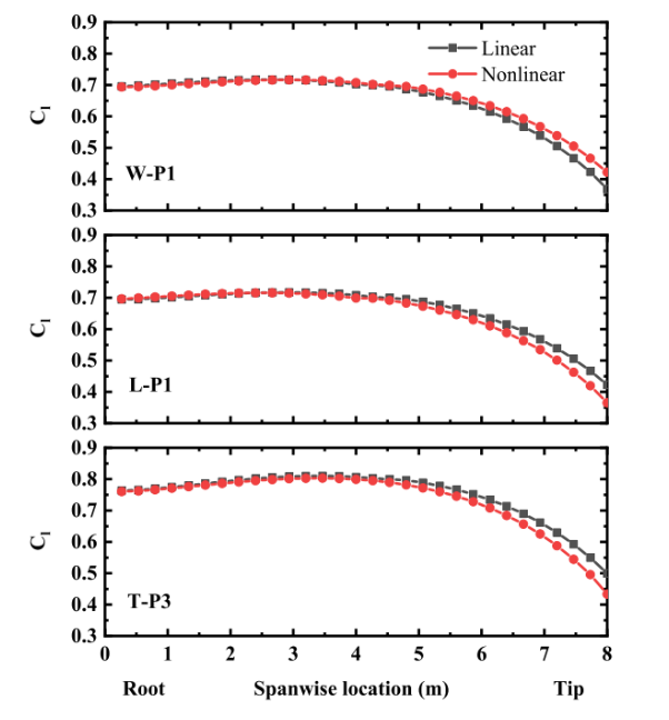 圖7. 不同GPL/Al納米復(fù)合材料板升力系數(shù)的展向線性/非線性結(jié)果。