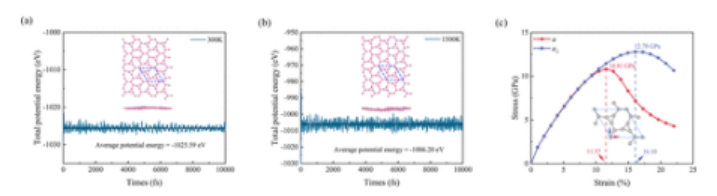 圖2:在(a)300和(b)1500K的溫度下,Cto-石墨烯的能量隨時間的波動。(c) Cto-石墨烯在雙軸拉伸應變下的拉伸-應變曲線。數(shù)字表示最大應變和抗拉強度。