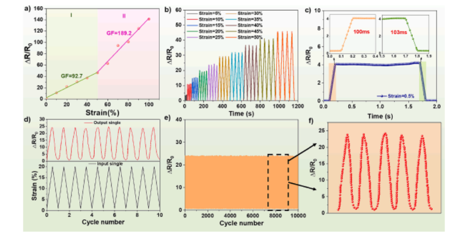 2復(fù)合材料的傳感性能,表現(xiàn)為優(yōu)異的靈敏度(GF = 189.2)、快速的響應(yīng)時間(102 ms)和超過10,000個循環(huán)的良好重復(fù)性。該裝置具有良好的機(jī)械傳感性能,能夠準(zhǔn)確地檢測人體生理信號。具體來說,該設(shè)備是一個應(yīng)變檢測器,通過監(jiān)測手指、手臂和大腿的運(yùn)動來識別不同的應(yīng)變信號。該研究為具有優(yōu)異導(dǎo)電性、柔韌性和穩(wěn)定性的復(fù)合材料制造提供了關(guān)鍵見解,而這些是創(chuàng)建高性能柔性傳感器的基本特性。