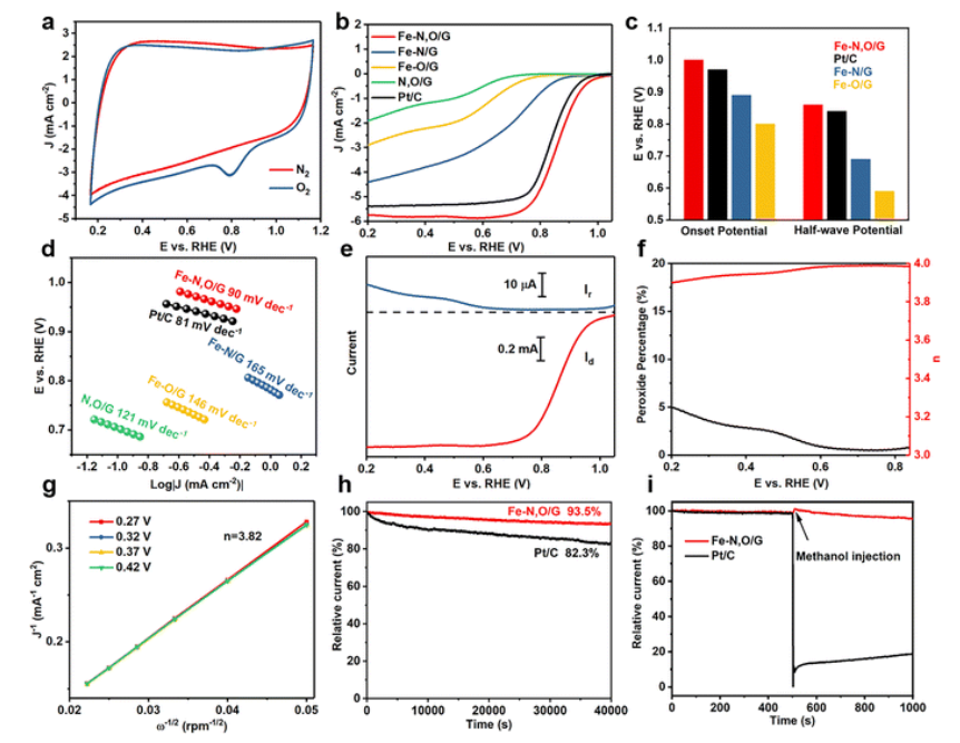 -1,1600 rpm)。 (c) Fe-N,O/G、Fe-N/G、Pt/C 和 Fe-O/G 相應(yīng)的起始電位和半波電位。 (d) Fe-N,O/G、Fe-N/G、Fe-O/G、N,O/G 和 Pt/C 的塔菲爾圖。 (e) 通過(guò) RRDE 測(cè)量記錄的 Fe-N,O/G 的環(huán)電流和盤(pán)電流。 (f)基于(e)計(jì)算的過(guò)氧化物百分比和電子轉(zhuǎn)移數(shù)(n)。 (g) Fe-N,O/G 的 K-L 圖和 n。 (h) Fe-N、O/G 和 Pt/C 的穩(wěn)定性曲線。 (i) Fe-N、O/G 和 Pt/C 的甲醇耐受性。