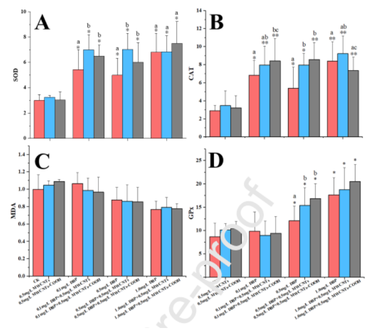 圖4. 不同濃度DBP染毒及與MWCNTs/MWCNTs-COOH共染毒144hpf后,斑馬魚(yú)胚胎/幼魚(yú)氧化應(yīng)激相關(guān)基因的mRNA相對(duì)表達(dá)量。