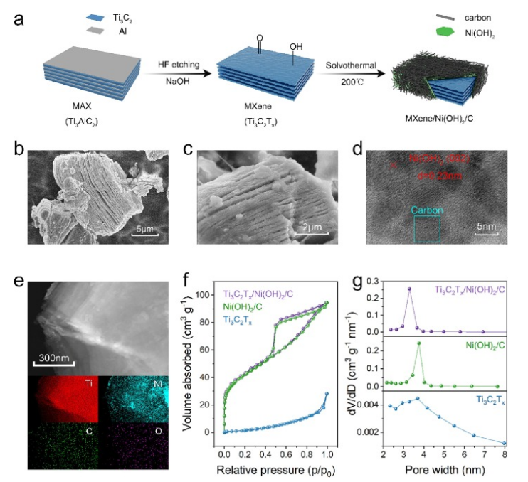 Fig 1. Ti3C2TX/Ni(OH)2/C 混合物的制造。 a)3D Ti3C2TX/Ni(OH)2/C復合材料的整體制備過程。 b) Ti3C2TX MXene ,c)Ti3C2TX/Ni(OH)2/C的 SEM 圖 。 d) TEM 和 e) Ti、Ni、C、O 的 EDS 元素圖。 f) 氮等溫線和g) Ti3C2TX/Ni(OH)2/C 的孔徑分布曲線。