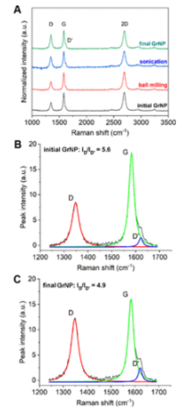 圖4. (A)GrNP在剝離過程中的拉曼分析。(B,C)D/G而不是D/D′峰比的增加表明,LPE期間GrNP的結(jié)構(gòu)變化主要與顆粒尺寸減小有關(guān)。