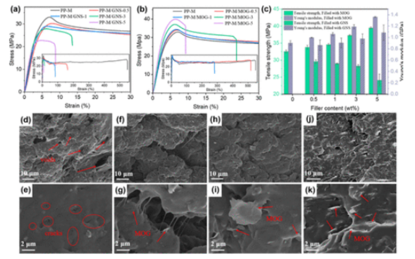 圖7.PP-M/GNS和PP-M/MOG納米復合材料的力學性能。(a)PP-M/GNS和(b)PP-M/MOG納米復合材料的拉伸應力-應變曲線。(c)不同填料含量的復合材料的拉伸強度和楊氏模量。(d–k)具有(f,g)0.5、(h,i)1和(j,k)5wt%MOG負載量的(d,e)PP-M基體和PP-M/MOG納米復合材料的拉伸斷裂表面的FESEM圖像。