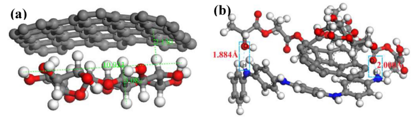 圖6. (a)優(yōu)化后的GN-MCC結(jié)構(gòu)。(b) PLA-GN-MCC/PANI分子結(jié)構(gòu)模型中的氫鍵示意圖。