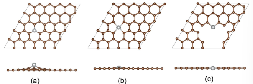 圖1. 優(yōu)化的Ni摻雜的單空位(a)、雙空位(b)、邊緣空位(c)石墨烯的俯視圖(上)和側(cè)視圖(下)。
