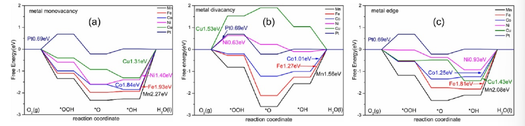 圖5.在1.23 V時在(a) M/MV (b) M/DV (c) M/EV上與標(biāo)準(zhǔn)氫電極的ORR的吉布斯自由能圖。