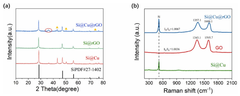 圖2. (a)復合材料的XRD譜圖包括立方硅的參考譜圖;(b)復合材料拉曼光譜。