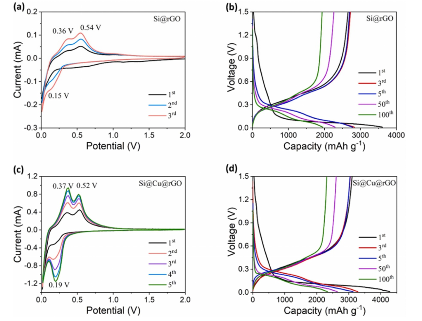 圖6. (a) Si@rGO和(c) Si@Cu@rGO陽極在0.1 mV/s時的CV曲線;(b) Si@rGO和(d) Si@Cu@rGO在100 mAg