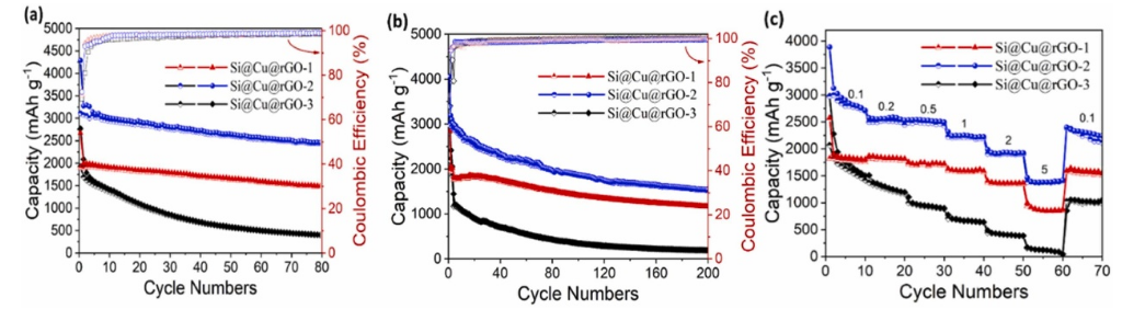 -1電流密度時Si@Cu@rGO-n (n=1,2,3)的長循環(huán)性能;(c) Si@Cu@rGO-n (n=1,2,3)的倍率性能。