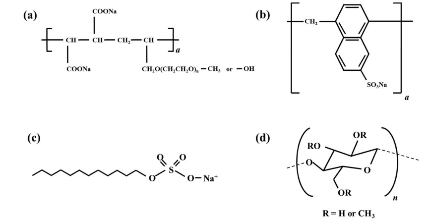 圖2. 用于分離和穩(wěn)定水溶液中石墨烯的有機(jī)添加劑的化學(xué)結(jié)構(gòu):(a)聚羧酸醚高效減水劑;(b)萘磺酸甲醛高效減水劑;(c)十二烷基硫酸鈉和(d)甲基纖維素。