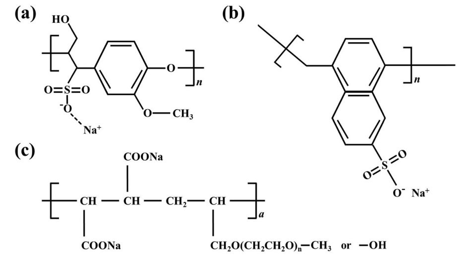 圖6. 三種減水劑的化學(xué)結(jié)構(gòu):(a)木質(zhì)素磺酸鈉;(b) b-萘磺酸甲醛縮聚物;(c)聚羧酸鹽高效減水劑(PC)。