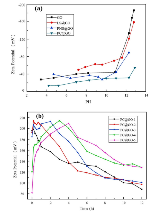 圖7. 不同減水劑/氧化石墨烯分散體的Zeta電位:(a) LS/GO、NFS/GO和PCE/GO溶液(減水劑:GO = 10)在不同pH條件下(KOH調(diào)節(jié))的Zeta電位;(b)水泥孔隙溶液中PCE/GO的zeta電位隨時(shí)間的變化(PCE: GO = 1-5:1,質(zhì)量)。