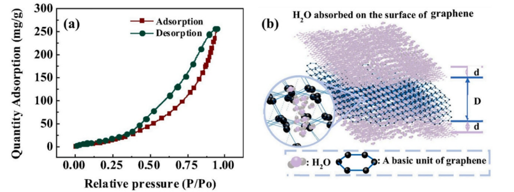 圖10. 石墨烯的吸水特性:(a)石墨烯的水蒸氣吸附/解吸等溫線;(b)石墨烯對(duì)水的吸附示意圖,以及吸水膜厚度。