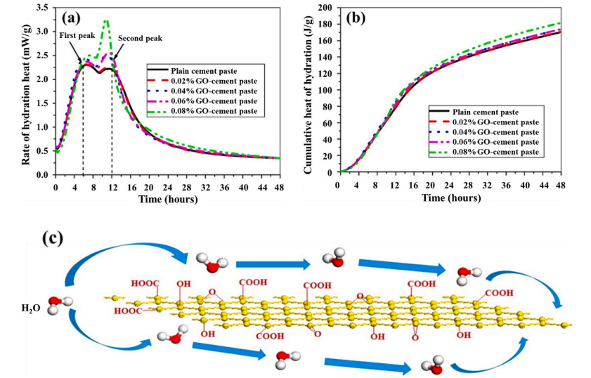 圖12. GO對(duì)水泥水化的影響:(a) 48 h內(nèi)水泥水化過(guò)程;(b) 48h內(nèi)總積熱;(c)GO對(duì)水泥水化的催化機(jī)理。