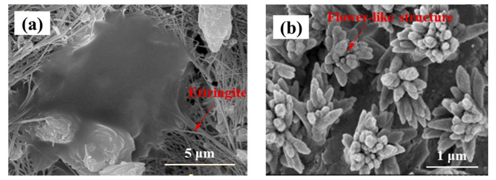 圖13. 添加石墨烯及其衍生物后水化產(chǎn)物變化的SEM圖像:(a)層狀雙氫氧化物(LDHs) ;(b)鈣礬石;(c)花狀結(jié)構(gòu)。