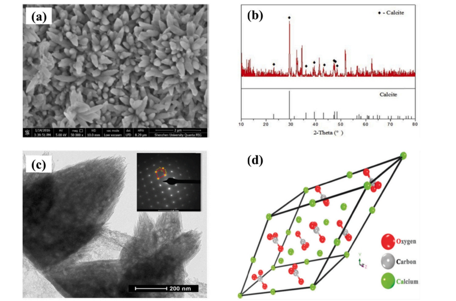 圖14. 碳酸鈣的形貌和晶體結(jié)構(gòu):(a) SEM圖像;(b) X-射線衍射(XRD)譜圖;(c)透射電子顯微鏡(TEM)圖像及其SAED圖譜;(d)方解石的晶體結(jié)構(gòu)。