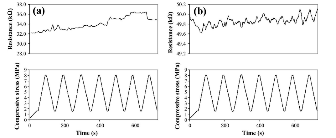 圖18. (a)純砂漿和(b)含6.4 wt%石墨烯砂漿的壓阻反應(yīng)。