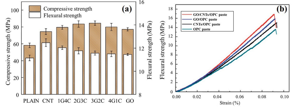 圖20. 不同比例的氧化石墨烯/碳納米管增強(qiáng)水泥漿體的機(jī)械強(qiáng)度:(a) Du等人和(b) Lu等人。
